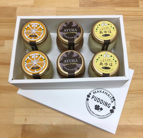 008/ あゆはプリン2個、なるとオレンジプリン2個、カカオプリン2個(合計6個、箱入り)